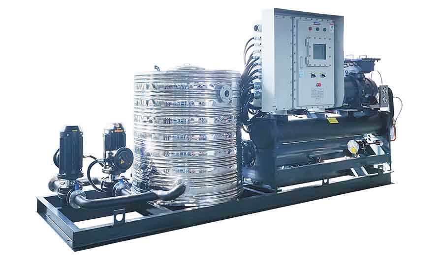 3、以鹽水為載冷劑的撬裝式螺桿制冷機組,蒸發器需防腐設置,控溫范圍在-5度至-40度;